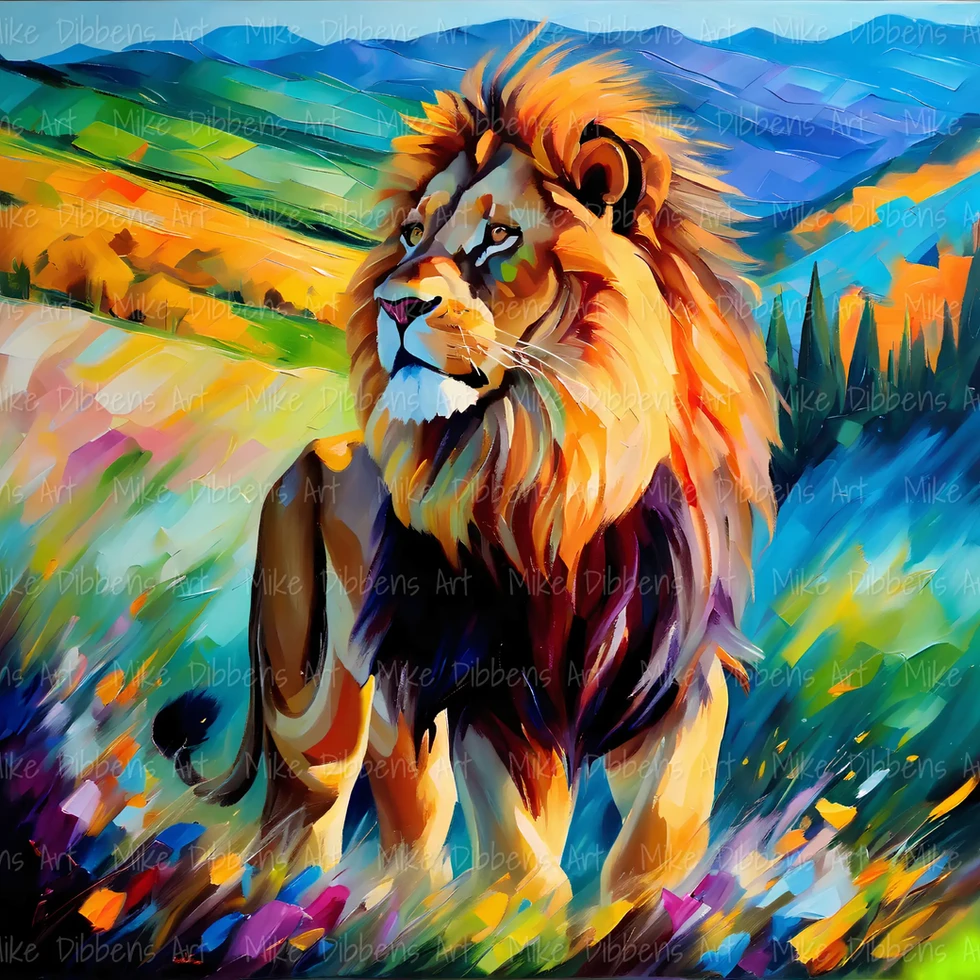 "‘Aslan’ is a bold and majestic tribute to the great lion of Narnia, symbolising strength, wisdom, and divine kingship. With flowing textures and radiant colour, Mike Dibbens captures both the gentleness and authority of this much-loved figure. As part of the Spiritual Kingdom Collection, the piece speaks to themes of courage, sacrifice, and renewal.