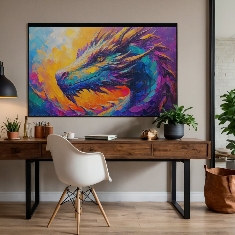 "‘Dragon’ brings mythical energy to the Animal Kingdom Collection, painted in bold layers of crimson, emerald, and sapphire. With dramatic brushstrokes, Mike Dibbens breathes fire and imagination into this legendary creature. A piece that symbolises power, wonder, and fantasy, it is perfect for those who love art with adventure.