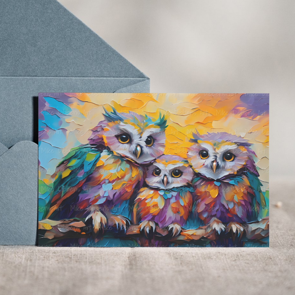 "‘Owls’ embodies wisdom and mystery, painted in deep purples, golds, and layered rainbow hues. Mike Dibbens’ brushstrokes capture their watchful presence and timeless allure. Part of the Animal Kingdom Collection, it symbolises guidance and insight.